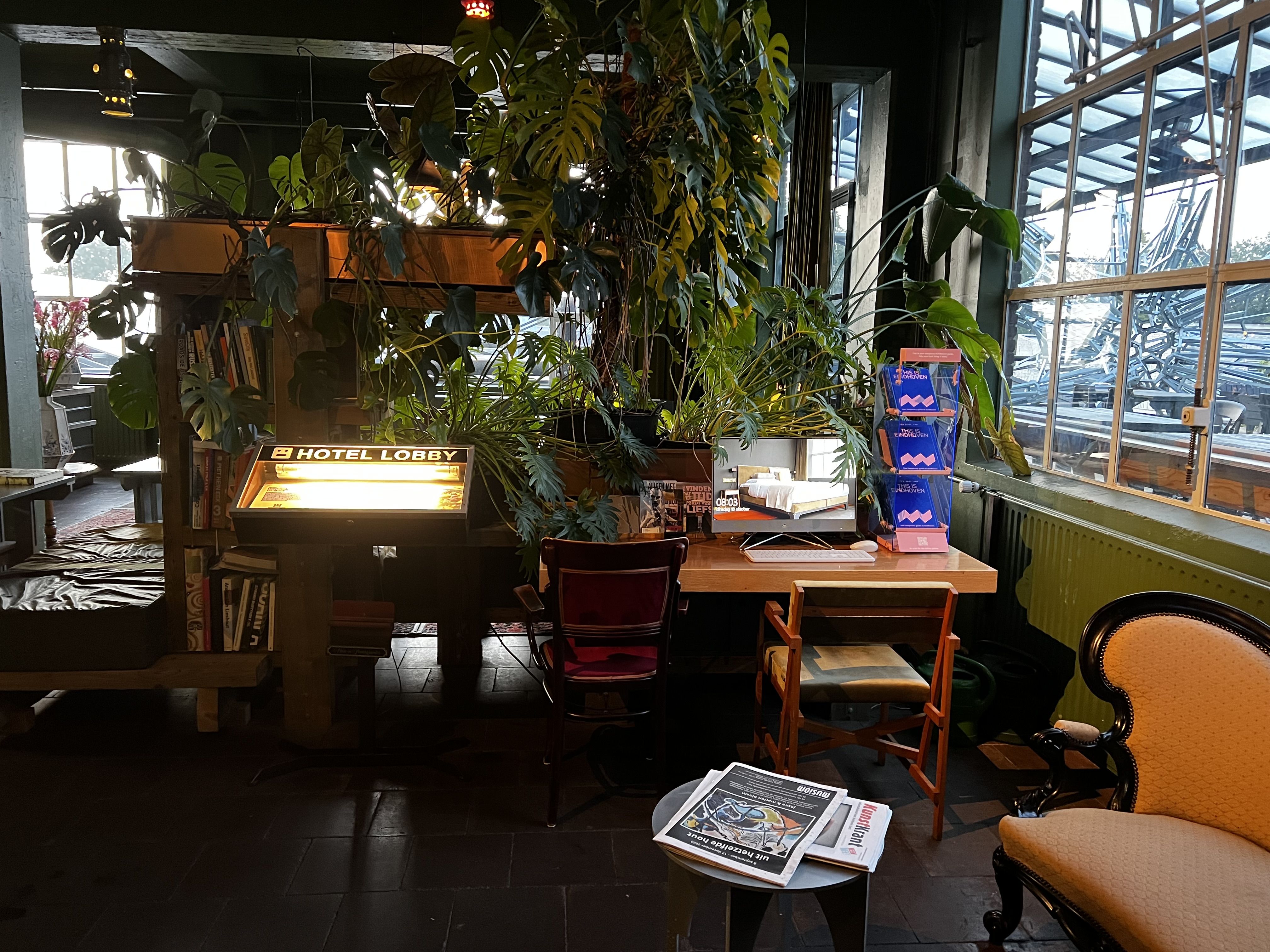 사람과 공간의 상호작용에서 피어나는 시너지를 기대한 의도가 숨겨져 있는 건 아닐까 생각했다. 군더더기 없는 심플한 공간임에도 가구와 오브제가 예술감을 물씬 풍기니 보이는 것과는 달리 화려함이 느껴졌다. 에인트호번 행은 앞서 여행한 암스테르담과 뒤이어 이틀 반짝 다녀올 파리 사이에서 쉼이 되길 바랐는데 그 기대와 바람이 제대로 충족됐다. 아무 것도 하지 않아도 좋을 곳이다. 아니, 아무 것도 하지 않을 계획으로 찾아야만 하는 곳이다. 아무 것도 하지 않기 위해 다시 발걸음 할 수 있을까? 인생이여, 내게 자비를 베풀어주길! 오래된 것을 탐닉하는 내가 인더스트리얼 디자인에 이토록 심취하게 될 줄도 몰랐는데 역시 나를 발견하는 일은 여전히 즐겁다. 올리브그린 색감을 향한 새로운 애정도 생겼다. 방과 로비 그리고 레스토랑 여기저기에서 침대 매트리스와 암체어, 커튼과 소파, 조명에 이르기까지 색의 향연이 유독 눈에 들어왔다. 반가웠던 또다른 발견은 올리브그린이 빨강색과 잘 어울린다는 것. 옷으로 두 색감을 매치해보고싶은 스타일링 욕심도 얻었다.
